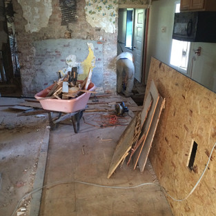 Next came the floors. When we started pulling up the floor in the kitchen....trouble began. We noticed the sewer line was disconnected and rotten under the floorboards. This means sewage was just spilling out under the house! Most of the joists needed to be replaced and we also needed a proper crawlspace to prevent future rot and allow access to new plumbing/electrical. So, we started digging, picking, and wheeling loads of dirt out of the house.